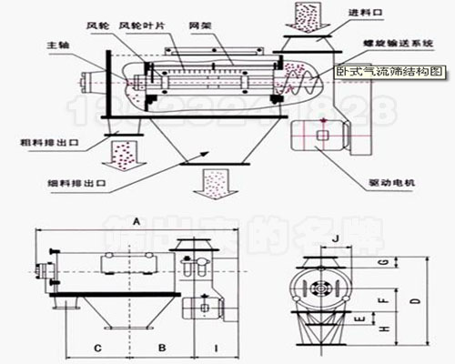 臥式氣流篩分機(jī)篩網(wǎng)為圓筒狀,置于機(jī)體內(nèi),物料通過螺旋輸送系統(tǒng)后,和氣流混合、霧化進(jìn)入網(wǎng)筒內(nèi);通過網(wǎng)筒內(nèi)風(fēng)輪葉片使物料同時(shí)受離心力和旋風(fēng)推進(jìn)力,從而近使物料噴射過網(wǎng),由細(xì)料排出口排出,不能過網(wǎng)的物料沿網(wǎng)筒壁從粗料排出口排出。